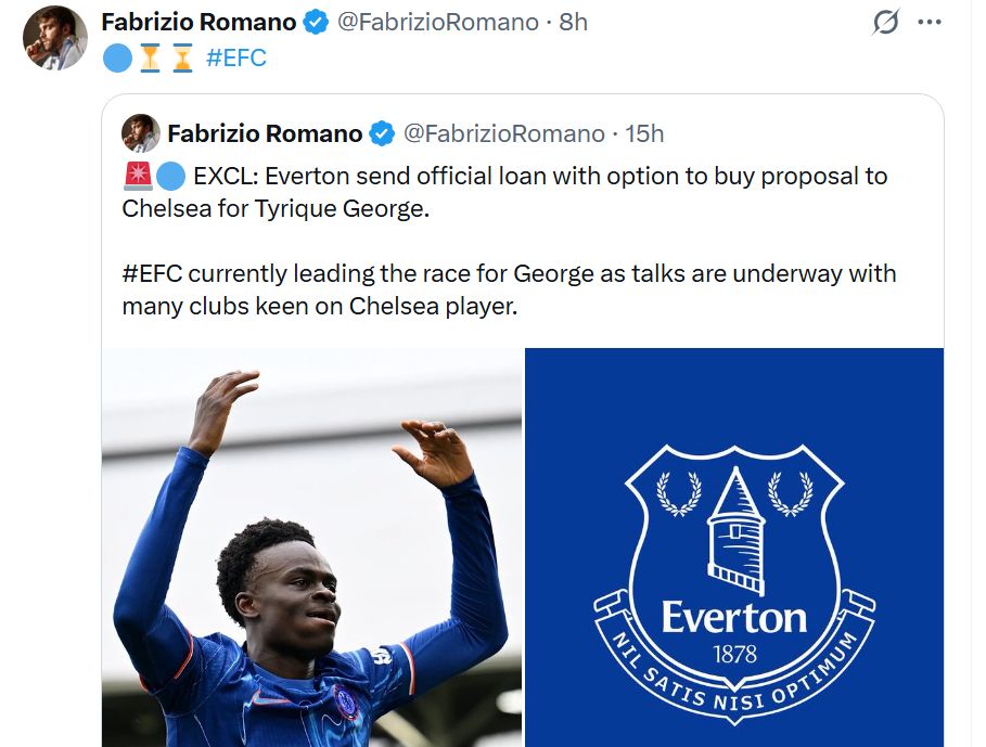 ‘EXCL: Everton send official loan with option to buy proposal to Chelsea for Tyrique George. #EFC currently leading the race for George as talks are underway with many clubs keen on Chelsea player.’